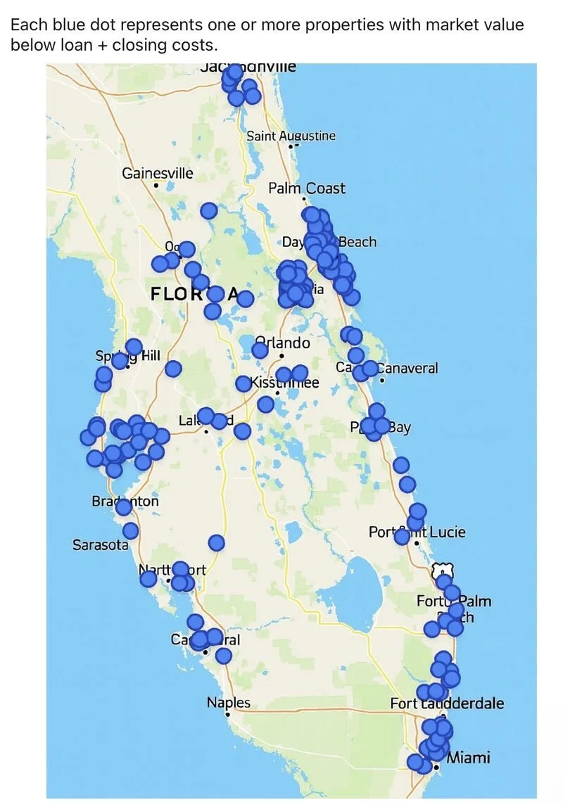 This map highlights more than 3,600 properties now with negative equity, and the pattern isn't random with clusters forming around the state.